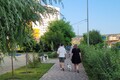 Во дворе, большая детская площадка с горками, качелями и столом для пинг-понга.