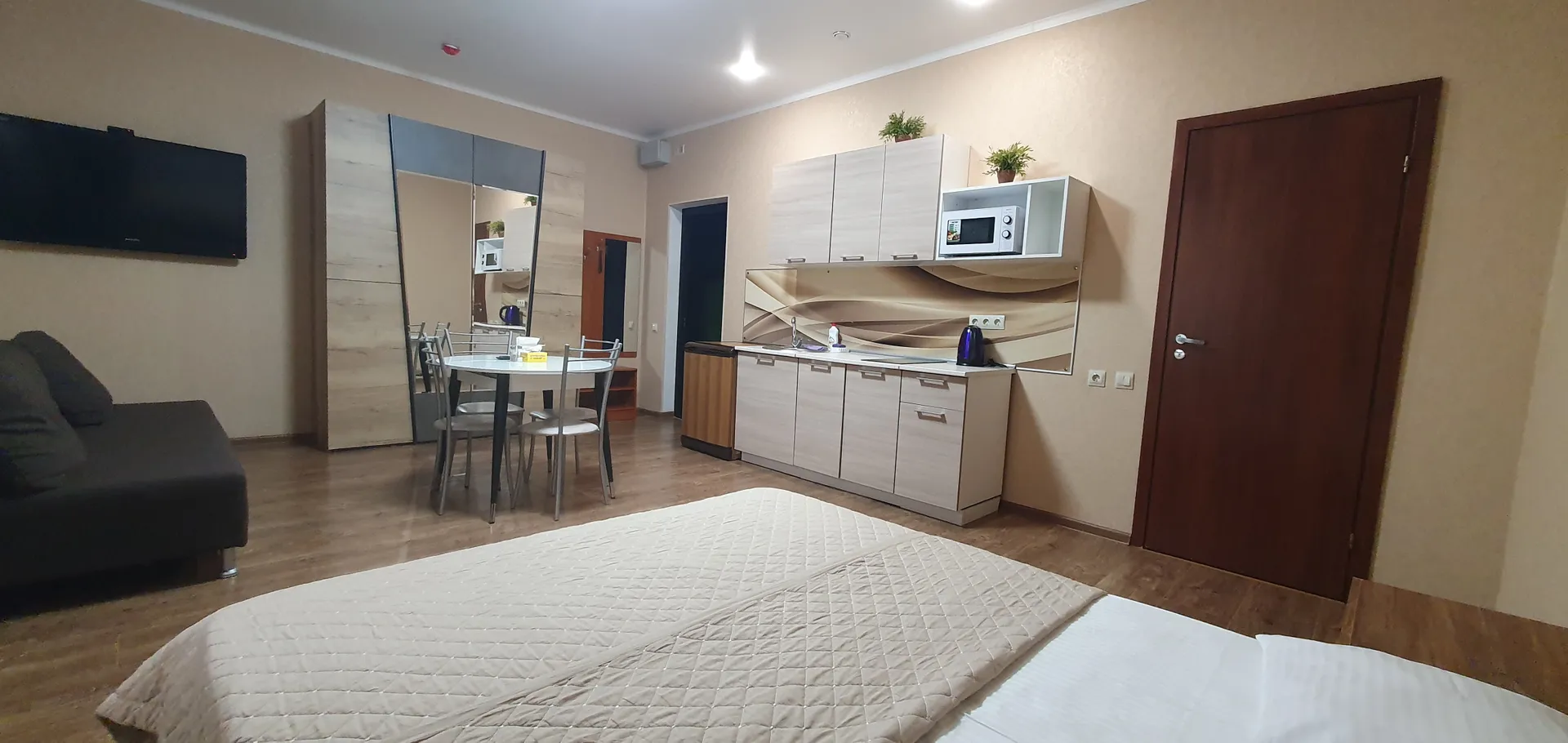 Хороший номер студия. Большая ванная комната. Не большой балкон с сушилкой, для курящих нормально. Второй этаж, уютно, телевизор работает хорошо. Мыло, бумага, полотенце, даже стиральный порошок в номере, спасибо хозяевам, всё необходимое есть.