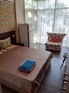 Проживали 20 дней Нас заселили в дополнительный дом на Новороссийской , 36 Двухэтажный дом , жилые комнаты на втором этаже, на первом этаже кухня (посуда, холодильники в наличии) и душевые комнаты, на улице под навесом столики! В комнате кондиционер, туалет и телевизор, кровать и диван, есть вай фай! Для комфортного пребывания на море есть все, что нужно!!! Все магазины и кафе находятся в шаговой доступности! Управляющий Дмитрий - просто душка!!! Строгий, но очень заботливый!!!