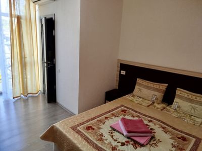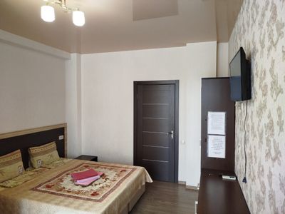 На фото не видно, на сколько мал номер (дверь в 50 см от спинки кровати). Заселились быстро, хозяин добродушный, учел пожелания по этажности.