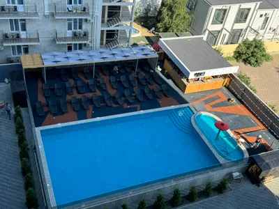 Очень хорошие апартаменты, претензий к номеру нет. Уютная квартира, всё для удобства есть: стиральная машина, посудомоечная машина, утюг, гладильная доска, фен, микроволновая печь, электроплита… вид из апартамента выходит во двор, на бассейн. Фото прилагаю. От моря очень близко, вот только мы попали в такое время, что море очень пахнет и загрязнено, надо поискать чистое место, лучше идти на центральный пляж. Рядом с местом есть всё, что нужно.