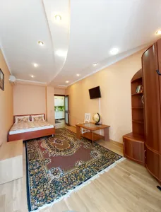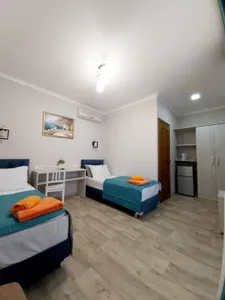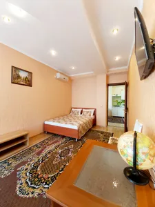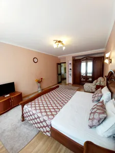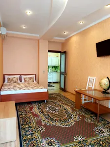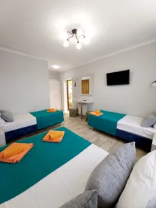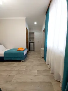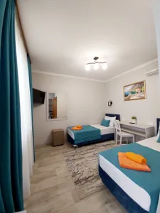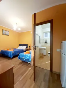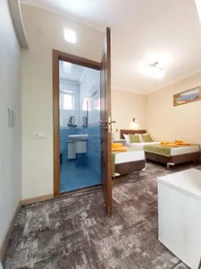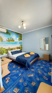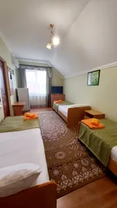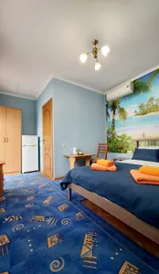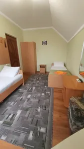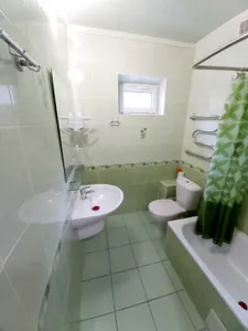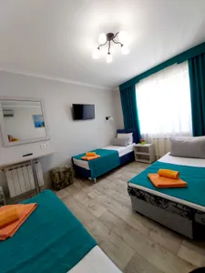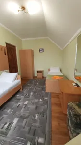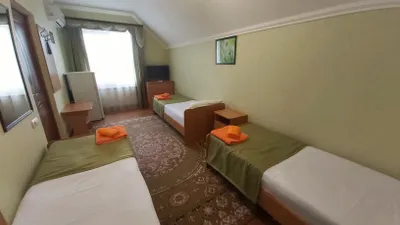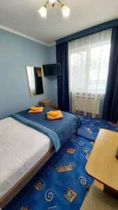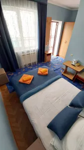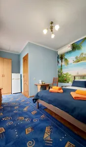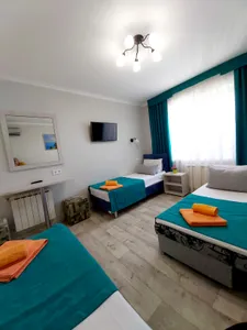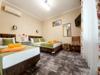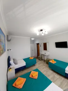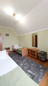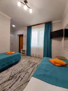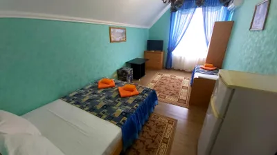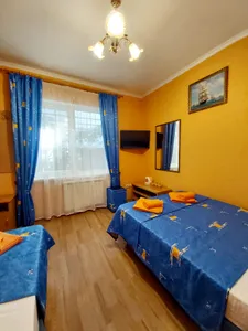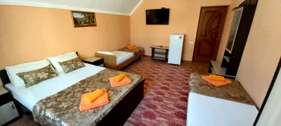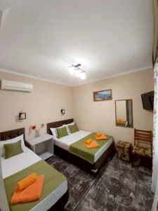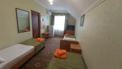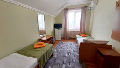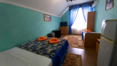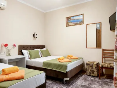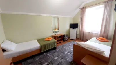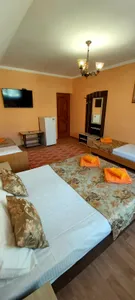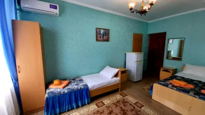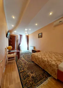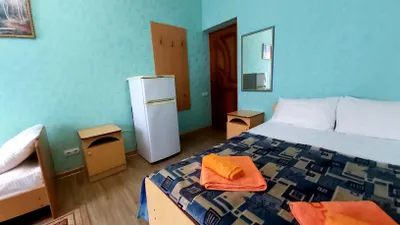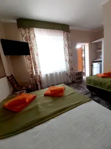 В номере стандарт находится санузел с мини-ванной, сплит-система, телевизор, холодильник, вся необходимая мебель, постельные принадлежности, фен,