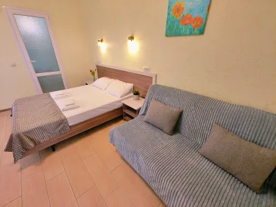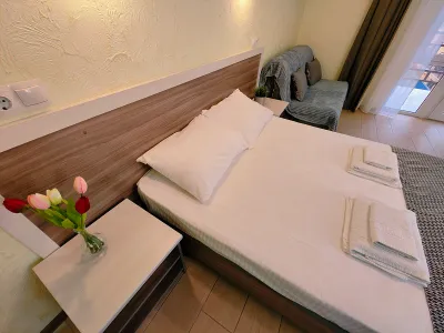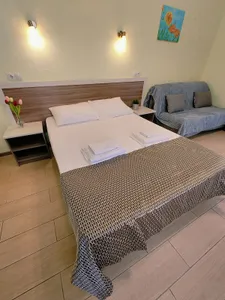 Прекрасная администратор, все важные моменты при заселении рассказала, показала, как пройти к морю, где ближайшие продуктовые магазины. Отличный бассейн с теплой водой и лежаки — оказались кстати, так как море было прохладным для купания первые дни. Номер просторный. До моря спокойным шагом 12-15 минут. Есть кухня, но мы на ней не готовили. По пути до моря много столовых, там вкусно и недорого.